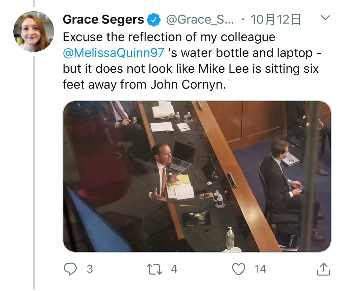 然而,確診后僅隔離10天,麥克·李就出現(xiàn)在了12日上午的大法官巴雷特提名確認(rèn)聽證會(huì)上。更令人震驚的是,他在發(fā)言時(shí)竟然任性地摘下了口罩,沒有任何防護(hù)。哥倫比亞廣播公司記者格蕾絲·塞格斯在推特上發(fā)的圖片顯示,當(dāng)時(shí),與李距離最近的參議員約翰·康寧僅在不到6英尺的近處,完全不符合社交距離的規(guī)定。