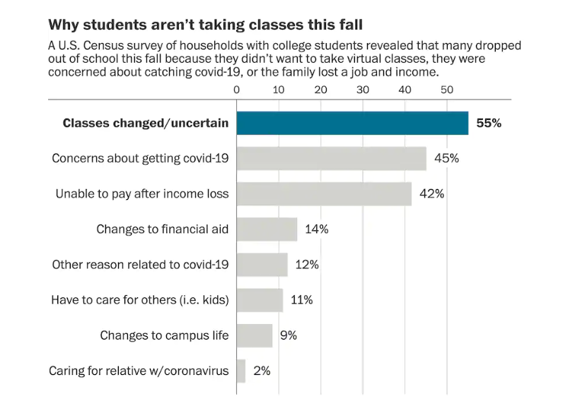 美國人口普查局?jǐn)?shù)據(jù)顯示,今年秋季因?yàn)榻?jīng)濟(jì)原因輟學(xué)的學(xué)生占42%。