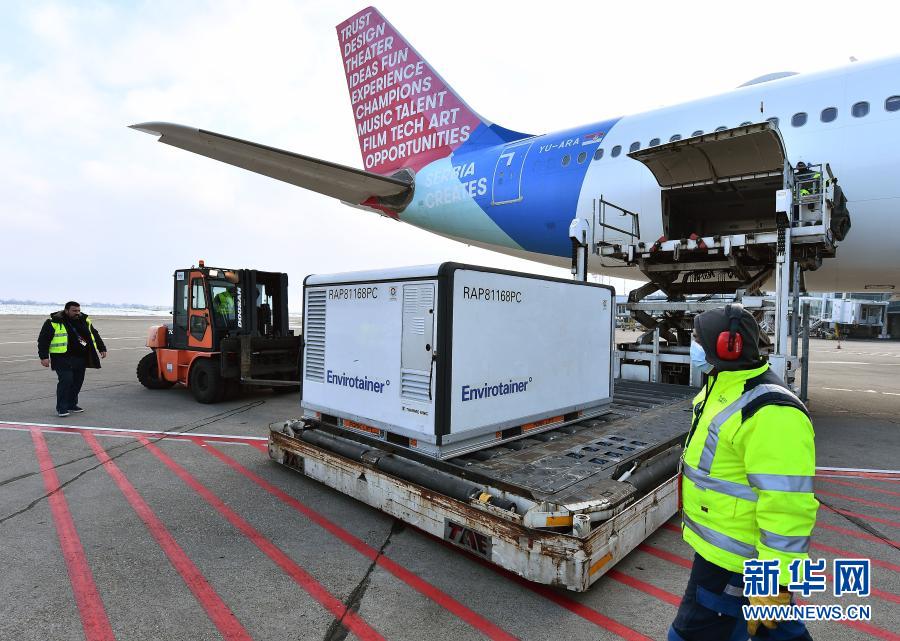 1月16日,在塞爾維亞首都貝爾格萊德,機場工作人員卸載首批100萬劑由中國國藥集團生產的新冠疫苗。新華社發(普雷德拉格·米洛薩夫列維奇 攝)