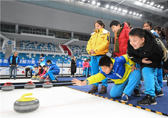 這是2019年12月10日,北京史家實驗學校的學生在“冰立方”體驗冰壺。新華社記者 鞠煥宗 攝