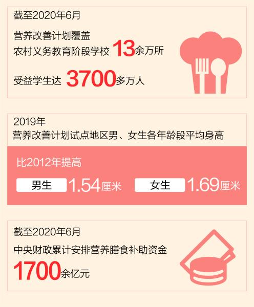 放眼全國,截至2020年6月,營養改善計劃覆蓋農村義務教育階段學校13余萬所,受益學生達3700多萬人。