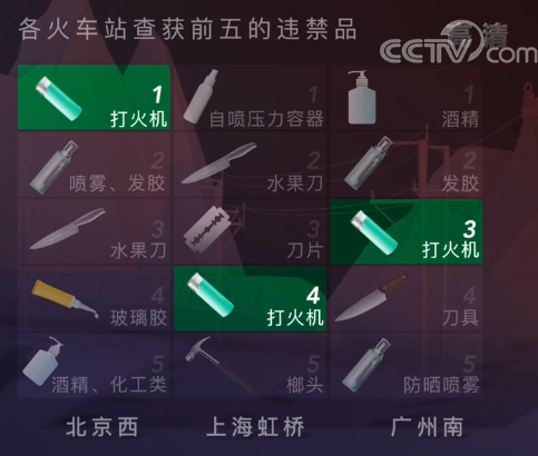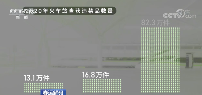 這是分別從北京西站、上海虹橋站和廣州南站拿到的數(shù)據(jù),在2020年,這三個(gè)火車站分別查獲數(shù)十萬件違禁品。