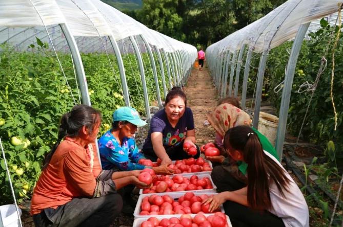 十三屆全國人大代表、內(nèi)蒙古自治區(qū)赤峰市小廟子村黨總支書記趙會(huì)杰(中)在蔬菜大棚了解西紅柿的生長情況。(資料照片)