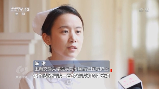 上海交通大學(xué)醫(yī)學(xué)院附屬瑞金醫(yī)院護(hù)士 陳琳:感謝信上面最后他寫道,他說(shuō)這個(gè)世上沒(méi)有救世主,是你們?cè)谌碎g創(chuàng)造奇跡。這個(gè)感謝信里面其實(shí)也描繪了平常我們工作中對(duì)他的點(diǎn)點(diǎn)滴滴的護(hù)理,我們對(duì)他的鼓勵(lì),包括我們對(duì)他的寬慰,平常對(duì)他的治療。這個(gè)感謝信我一直放著,我就特別感動(dòng)。