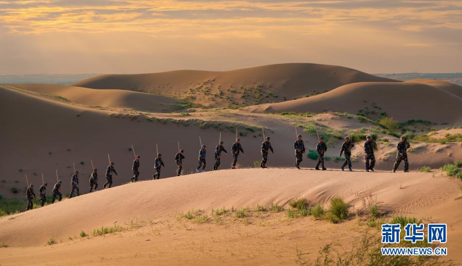 內蒙古鄂爾多斯市杭錦旗人武部組織干部職工和民兵深入庫布其沙漠開展治沙綠化(2019年9月4日攝)。新華社發(楊建榮 攝)