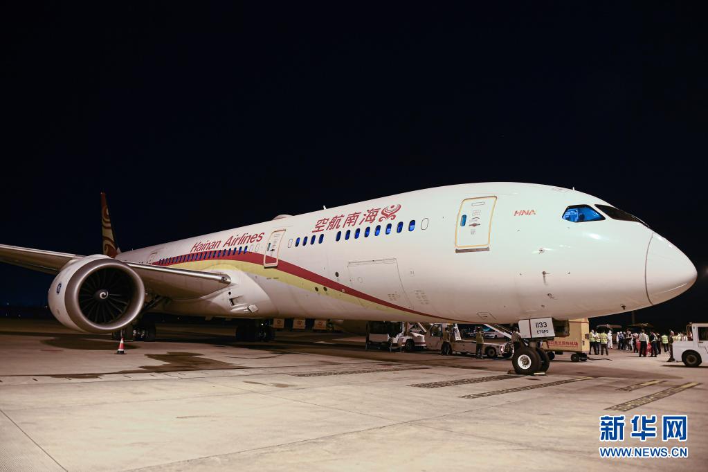 這是3月26日在海口美蘭國際機場拍攝的海南航空HU787航班。3月27日凌晨,該航班搭載貨物從海口飛往法國巴黎,海南自貿(mào)港首條定期洲際貨運航線正式開通。新華社記者 蒲曉旭 攝