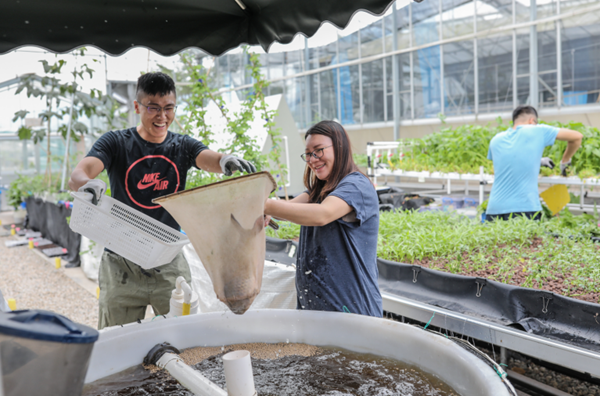 “養(yǎng)魚(yú)不換水,種菜不施肥,這就是我們開(kāi)發(fā)的‘魚(yú)菜共生’系統(tǒng),其本質(zhì)是一個(gè)循環(huán)農(nóng)業(yè)項(xiàng)目”。香港青年梁立峰是項(xiàng)目的創(chuàng)始人之一,他告訴記者,“魚(yú)菜共生”的原理是在溫室內(nèi)通過(guò)水處理系統(tǒng),將集約式養(yǎng)魚(yú)所產(chǎn)生的富營(yíng)養(yǎng)水體,轉(zhuǎn)化成為蔬菜可以吸收的營(yíng)養(yǎng),從而種植有機(jī)水培蔬菜。“所有的蔬菜都是零農(nóng)殘,因?yàn)橐坏┦┝宿r(nóng)藥和化肥,魚(yú)兒就死了,”梁立峰說(shuō)。