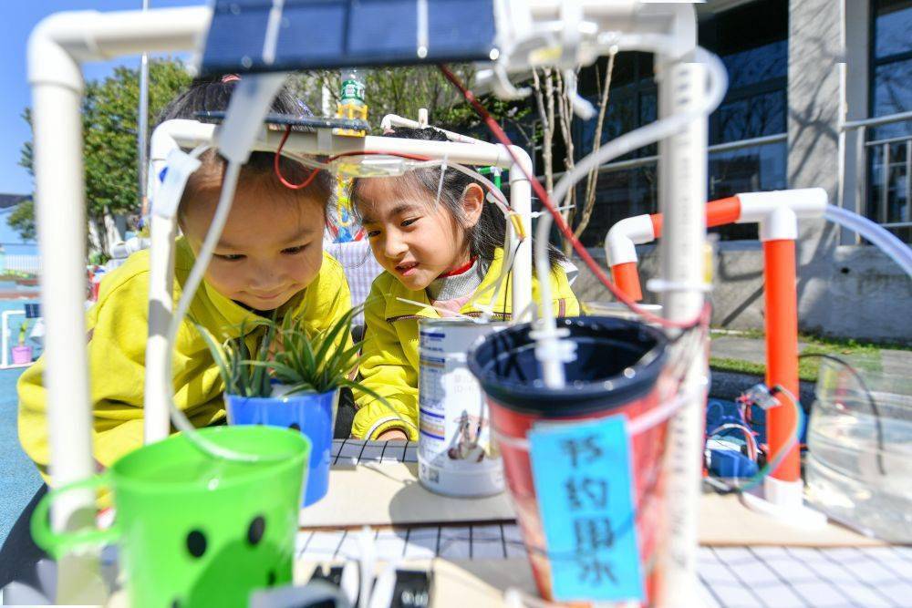 ↑3月22日,浙江省湖州市長興縣泗安鎮中心幼兒園的孩子們體驗節水環保科技小發明。