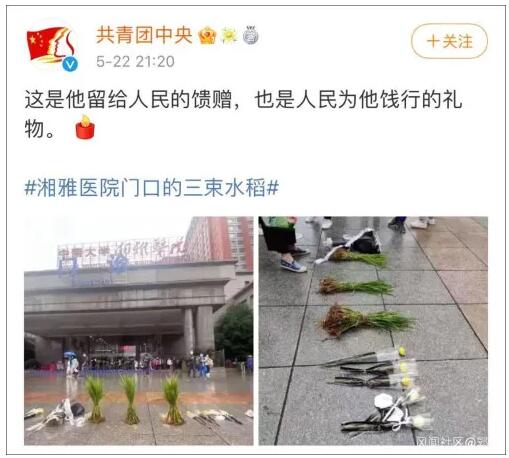 據(jù)瀟湘晨報報道,在花束中間,還有市民送來三“束”水稻苗,水稻挺立在醫(yī)院門口,寄托著一種別樣的哀思。