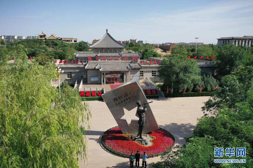 寧夏吳忠市同心縣紅軍西征紀(jì)念館前的小號(hào)手雕塑(無(wú)人機(jī)照片,6月22日攝)。新華社記者 王鵬 攝