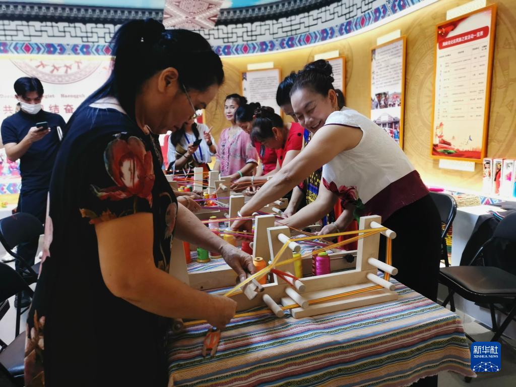 在廣西南寧市青秀區(qū)鳳嶺北社區(qū)民族之家,社區(qū)居民在用簡易織機(jī)制作壯錦(2020年7月21日攝)。新華社記者 黃慶剛 攝