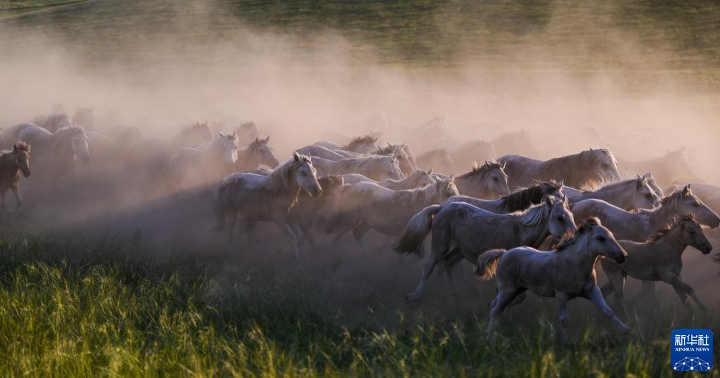 馬群馳騁在內蒙古錫林郭勒大草原上(2020年7月31日攝)。新華社記者 連振 攝