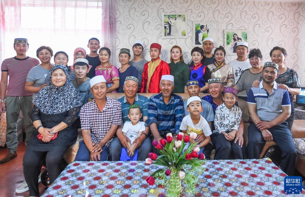 這是家住內蒙古呼倫貝爾的夏民山(前排右三)家的家庭合影。他家由回族、漢族、蒙古族、達斡爾族、鄂溫克族、滿族共6個民族組成,45口人,三代同堂(2017年7月16日攝)。新華社記者 連振 攝