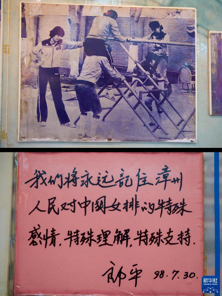 這是福建漳州體育訓(xùn)練基地中國(guó)女排騰飛館內(nèi)展出的郎平等老女排隊(duì)員當(dāng)年訓(xùn)練的照片(上),以及郎平于1998年寫(xiě)給漳州人民的寄語(yǔ)(2016年8月31日翻拍)。新華社記者姜克紅攝