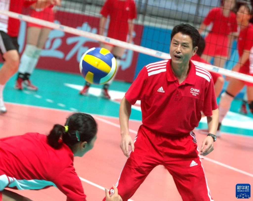 2006年8月30日,中國(guó)女排主教練陳忠和(右)在寧波北侖訓(xùn)練基地指導(dǎo)隊(duì)員進(jìn)行賽前訓(xùn)練。新華社記者徐昱攝