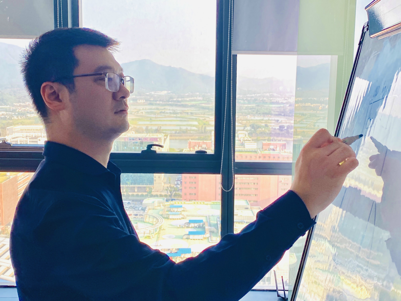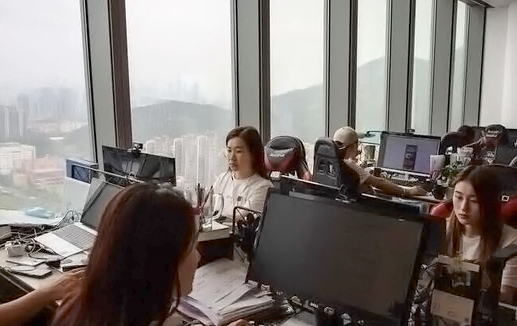 △廣東省深圳市前海世貿大廈,年輕人在一家創業企業中工作,窗外正是前海深港合作區。