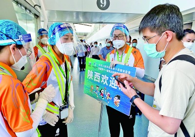 9月14日,在西安咸陽機場,工作人員為參加全運會的記者提供服務。光明日報記者 郭紅松攝/光明圖片