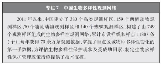 完善監測觀測網絡。中國建立起各類生態系統、物種的監測觀測網絡,在生物多樣性理論研究、技術示范與推廣以及物種與生境保護方面發揮了重要作用,為科研、教育、科普、生產等各領域提供了多樣化的信息服務與決策支持。其中,中國生態系統研究網絡(CERN)、國家陸地生態系統定位觀測研究網絡(CTERN)涵蓋所有生態系統和要素,中國生物多樣性監測與研究網絡(Sino BON)覆蓋動物、植物、微生物等多種生物類群,中國生物多樣性觀測網絡(China BON)構建了覆蓋全國的指示物種類群觀測樣區。
