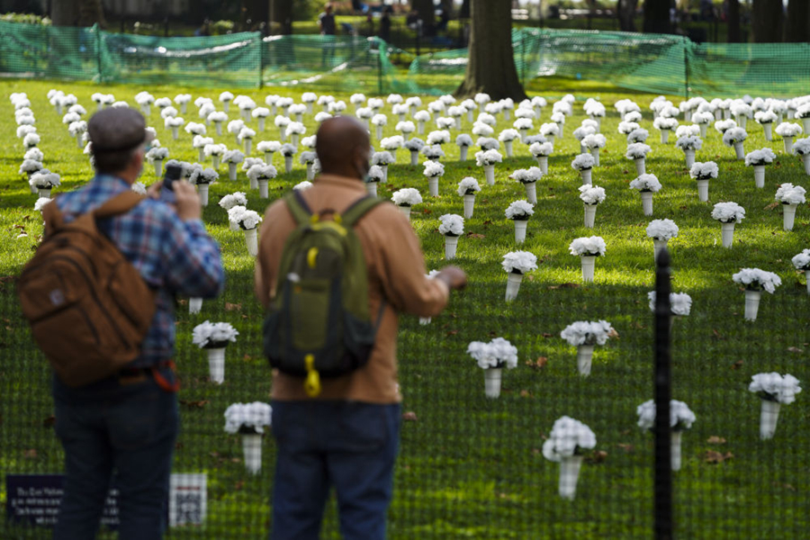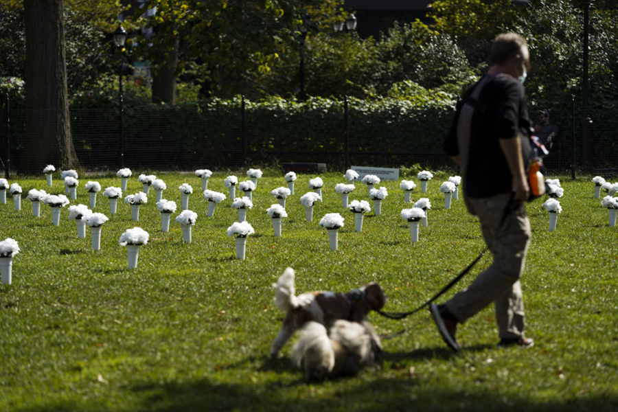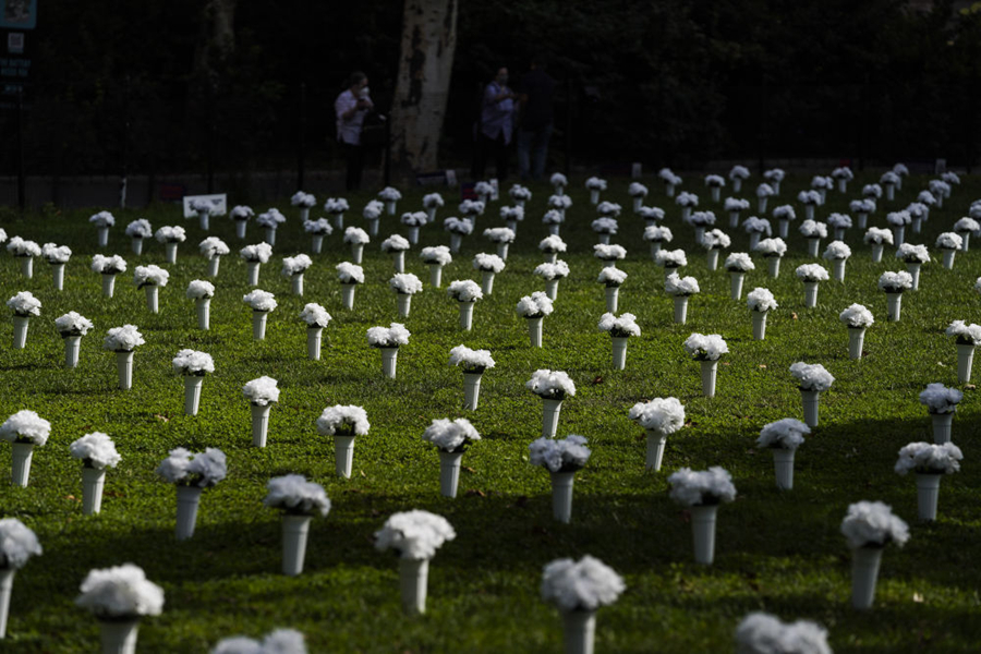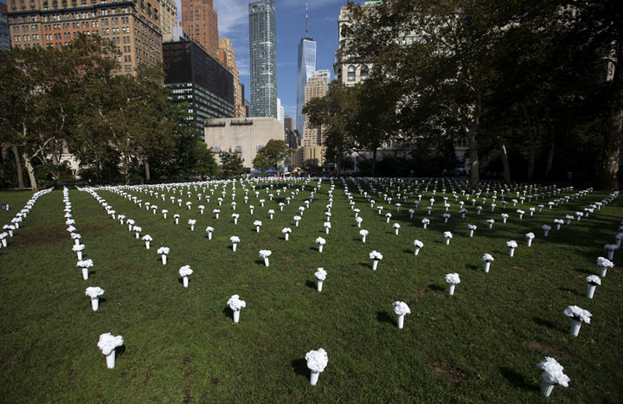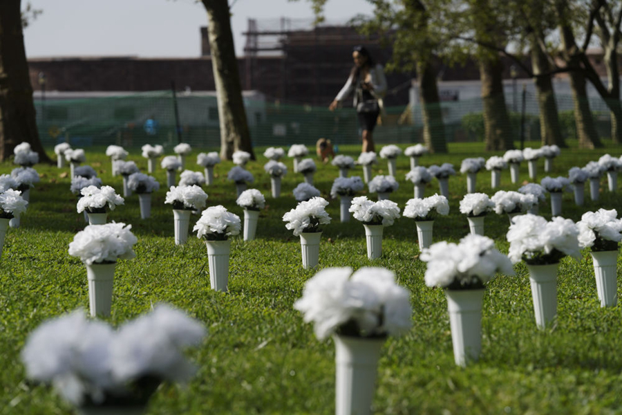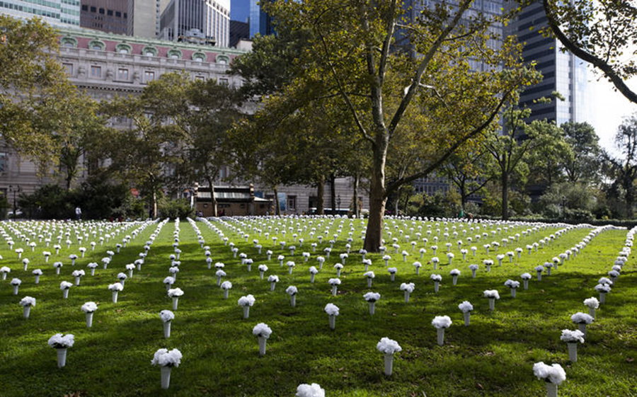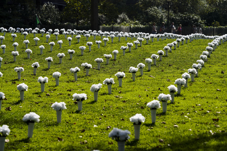 10月8日,在美國(guó)紐約炮臺(tái)公園,1050個(gè)白色瓶花組成大型紀(jì)念裝置,悼念2020年在紐約州死于槍支暴力的1050名受害者,呼吁政府針對(duì)槍支暴力采取行動(dòng)。