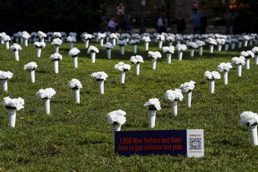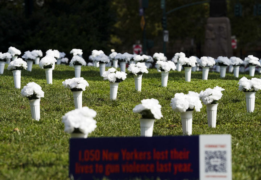 全球連線(xiàn) 丨 美國(guó)紐約:白色瓶花悼念槍支暴力遇難者