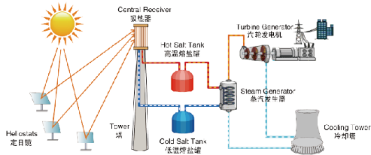 聚光系統熔鹽塔式光熱電站原理。資料圖