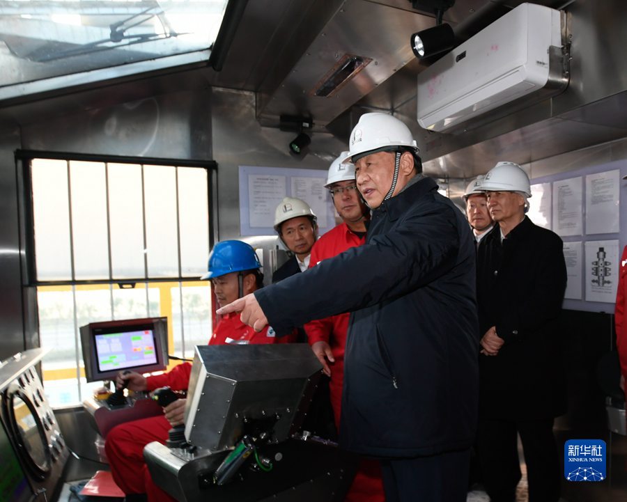 10月22日下午,中共中央總書記、國家主席、中央軍委主席習(xí)近平在山東省濟南市主持召開深入推動黃河流域生態(tài)保護和高質(zhì)量發(fā)展座談會并發(fā)表重要講話。這是座談會前,習(xí)近平21日下午在位于東營市萊州灣的勝利油田萊113區(qū)塊考察時,登上二層鉆井平臺,察看鉆井自動化設(shè)備。 新華社記者 李學(xué)仁 攝
