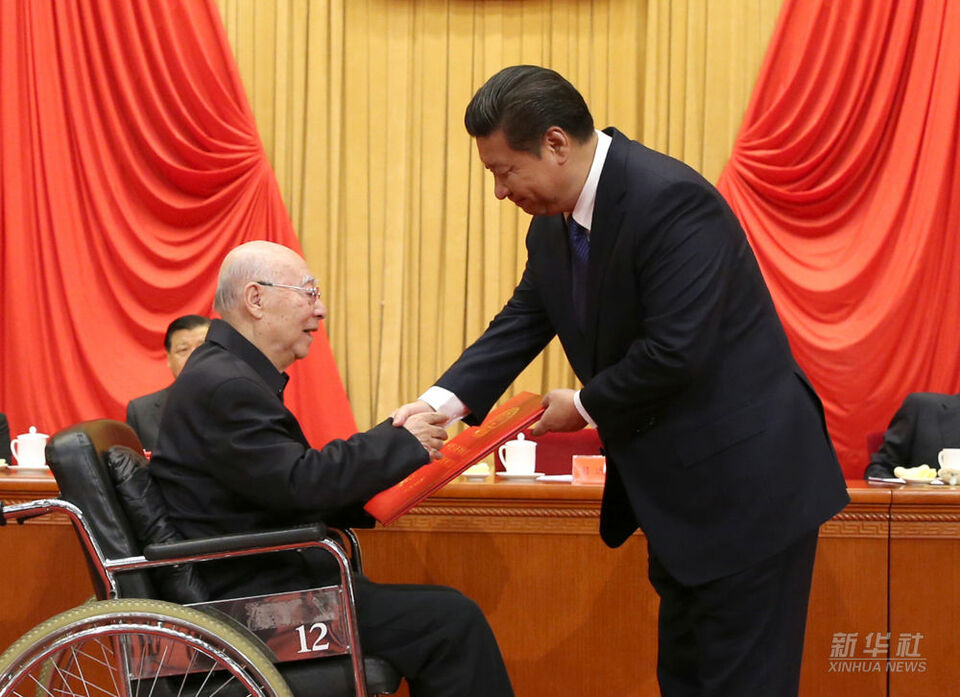 2014年度國家科學技術獎勵大會上,習近平總書記彎下腰向坐在輪椅上的中國科學院院士于敏頒發2014年度國家最高科學技術獎。