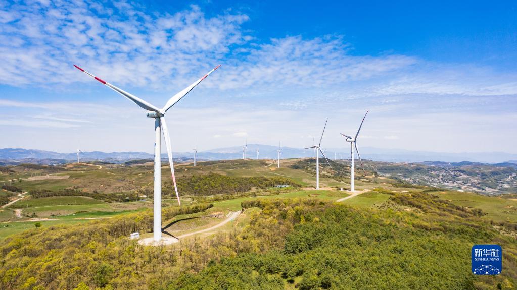 貴州省威寧彝族回族苗族自治縣雪山鎮(zhèn)的風(fēng)力發(fā)電設(shè)備(2020年4月27日攝,無人機(jī)照片)。新華社記者 陶亮 攝