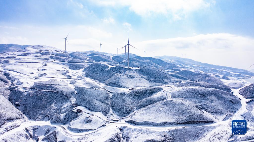 雪后的六盤水市盤州四格風(fēng)電場(1月12日攝,無人機(jī)照片)。新華社記者 陶亮 攝