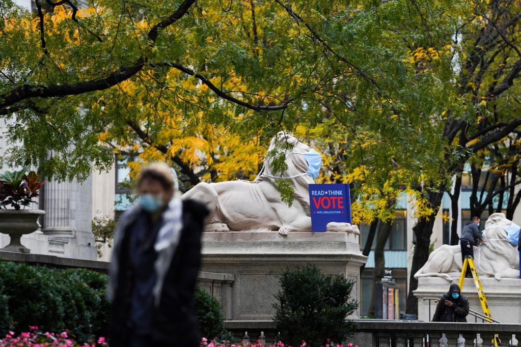 2020年11月2日,行人經過美國紐約公立圖書館外鼓勵投票的廣告。(新華社記者王迎攝)
