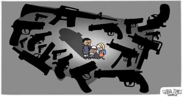 ▲ 槍支暴力將美國一幕幕魔幻的法治荒誕劇推向高潮。(漫畫 | 劉蕊)