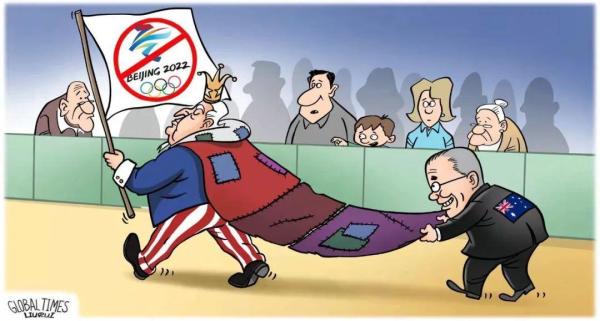 ▲ 美國拒絕聯署北京冬奧會奧林匹克休戰決議,宣稱“外交抵制”北京冬奧會,才是禍害世界和平的毒瘤。而澳大利亞等國甘當侍從,卑微托起美國破爛不堪的披風。(漫畫 | 劉蕊)