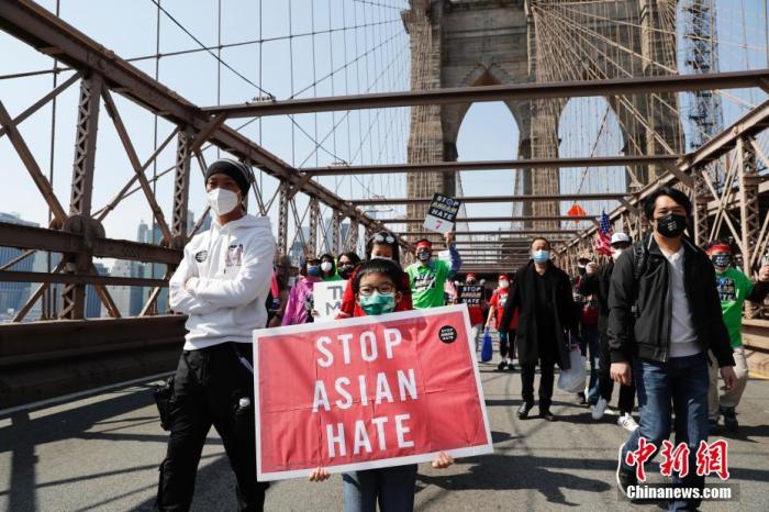 當地時間4月4日,紐約舉行反仇恨亞裔大游行,上萬民眾手持標語在曼哈頓弗利廣場集會后,游行穿過布魯克林大橋至布魯克林卡德曼廣場。圖為游行隊伍中手持“停止仇恨亞裔”標語的亞裔孩童。 中新社記者 廖攀 攝