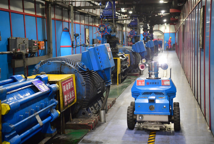 曹家灘智慧礦山井下的中央水泵房智能巡檢機(jī)器人在巡檢。 新華社記者邵瑞 攝