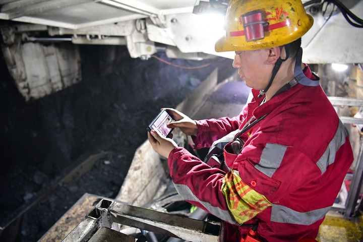 在曹家灘智慧礦山智能化工作面內(nèi),綜采二隊(duì)機(jī)電副隊(duì)長(zhǎng)蔡進(jìn)通過操作手機(jī)控制生產(chǎn)設(shè)備。新華社記者邵瑞 攝