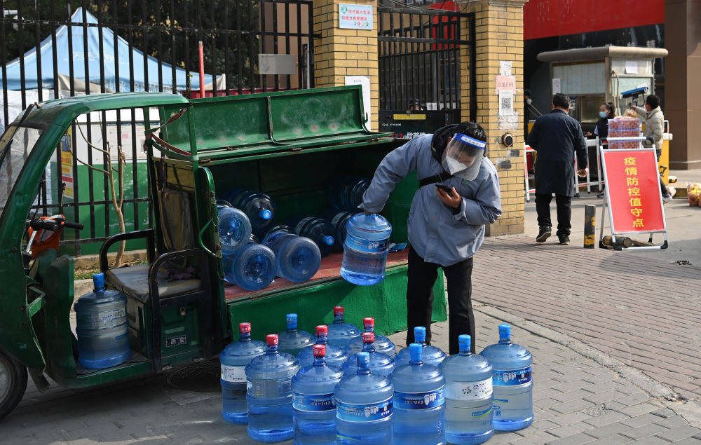 1月10日,一家快遞企業員工在為蓮湖區一小區配送純凈水。新華社記者 陶明 攝