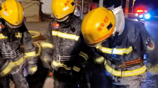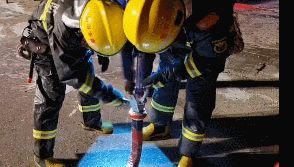 消防員不得不用錘子將水帶上厚厚的冰殼鑿碎
