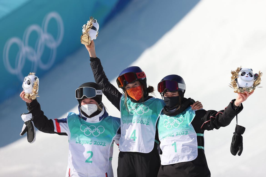 2月8日,奪得冠軍的中國選手谷愛凌(中)、獲得亞軍的法國選手泰絲·勒德(左)和獲得季軍的瑞士選手瑪蒂爾德·格雷莫德在頒發紀念品儀式上。新華社記者 丁旭攝
