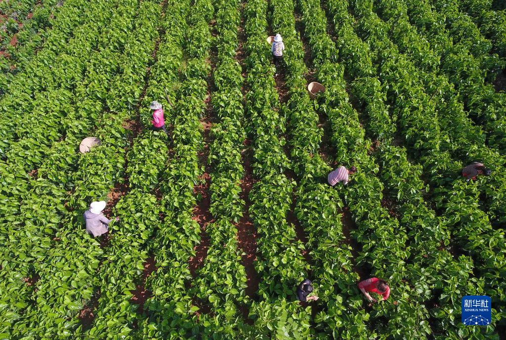云南尋甸縣金所街道草海子村的農(nóng)婦在采摘蠶桑葉(2020年5月16日攝,無(wú)人機(jī)照片)。當(dāng)?shù)卮罅Πl(fā)展蠶桑等特色種養(yǎng)殖和加工產(chǎn)業(yè),帶動(dòng)農(nóng)民脫貧增收致富。新華社記者 楊宗友 攝
