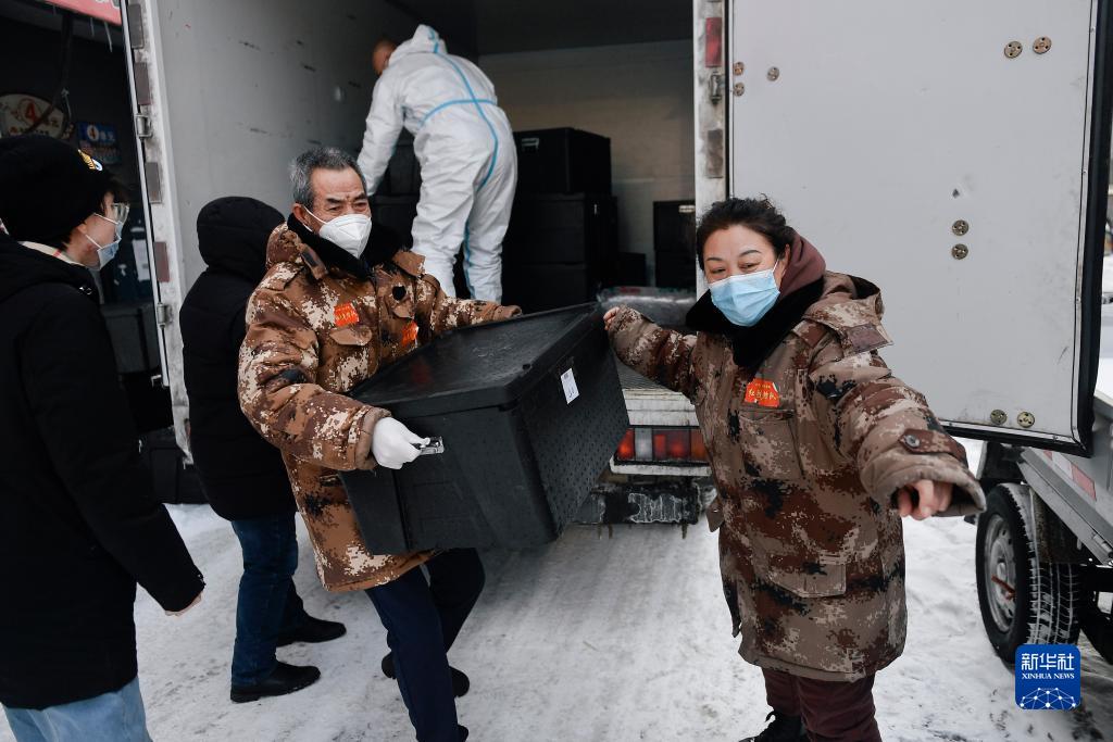 趙淑華(右一)指揮社區(qū)工作人員和志愿者搬運(yùn)盒飯(2021年2月15日攝)。趙淑華是吉林省通化市東昌區(qū)團(tuán)結(jié)街道文化社區(qū)副主任、網(wǎng)格長(zhǎng),臨近退休的她毫不猶豫投身抗疫一線(xiàn)。新華社記者 許暢 攝