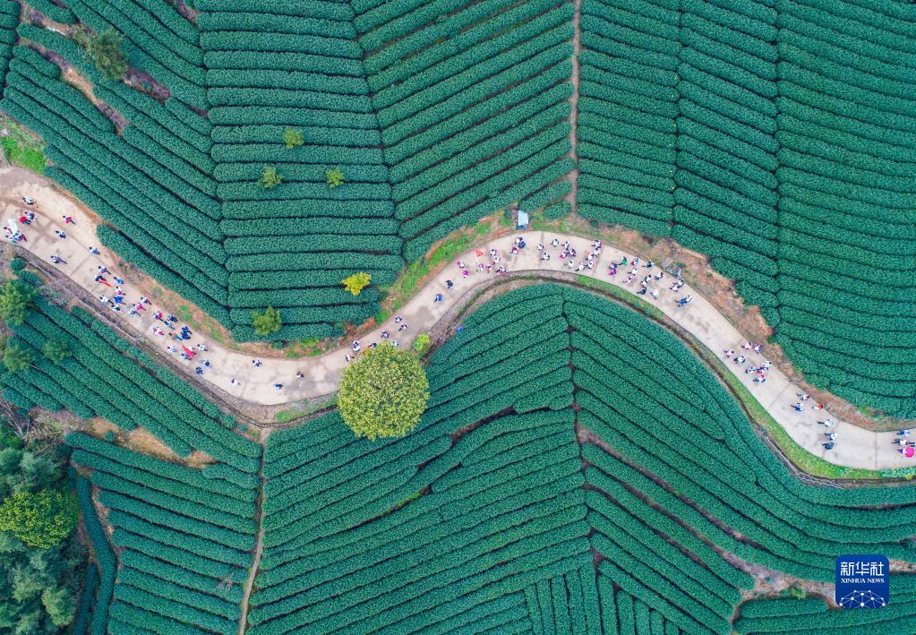 團(tuán)隊(duì)游客在杭州市富陽(yáng)區(qū)拔山村萬(wàn)畝茶山游覽(2018年3月26日攝,無(wú)人機(jī)照片)。浙江省“千村示范、萬(wàn)村整治”工程撬動(dòng)了鄉(xiāng)村從美麗生態(tài)到美麗經(jīng)濟(jì),再到美好生活的良性循環(huán)。2018年,浙江“千萬(wàn)工程”獲得聯(lián)合國(guó)“地球衛(wèi)士獎(jiǎng)”中的“激勵(lì)與行動(dòng)獎(jiǎng)”。新華社記者 徐昱 攝