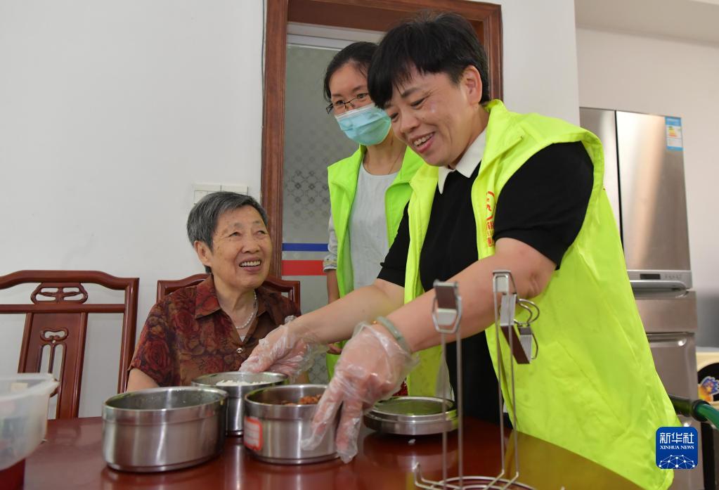 在江西省南昌市東湖區(qū)彭家橋街道文教路北社區(qū),“幸福食堂”的義工在給社區(qū)內(nèi)出行困難的老人提供送餐服務(wù)(2020年7月29日攝)。從2018年12月起,南昌市東湖區(qū)彭家橋街道在社區(qū)打造以黨建引領(lǐng)、社區(qū)主導(dǎo)、愛(ài)心企業(yè)贊助的“幸福食堂”,專(zhuān)門(mén)為社區(qū)獨(dú)居、孤寡及生活困難的老年人提供營(yíng)養(yǎng)餐,以此進(jìn)一步完善社區(qū)居家互助養(yǎng)老服務(wù)。新華社記者 彭昭之 攝