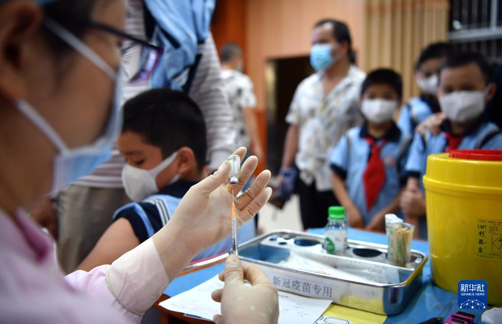 醫護人員在海口市瓊山第三小學為學生接種疫苗(2021年10月28日攝)。新華社記者 郭程 攝