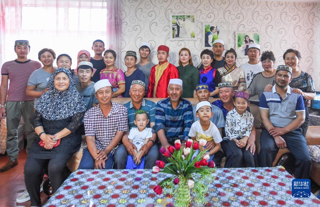 這是家住內蒙古呼倫貝爾的夏民山(前排右三)家的家庭合影。他家由回族、漢族、蒙古族、達斡爾族、鄂溫克族、滿族共6個民族組成,45口人,三代同堂(2017年7月16日攝)。新華社記者 連振 攝