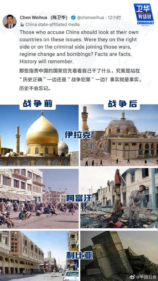陳衛(wèi)華在推文中指出了所謂“歷史正確一邊”的雙標(biāo)。他說,那些指責(zé)中國(guó)站在歷史錯(cuò)誤一邊的人不知道他們自己在說什么。當(dāng)中國(guó)反對(duì)并譴責(zé)伊拉克和阿富汗戰(zhàn)爭(zhēng)、利比亞政權(quán)更迭、無人機(jī)襲擊主權(quán)國(guó)家、對(duì)古巴的禁運(yùn)時(shí),中國(guó)可真是站在了他們所謂的“錯(cuò)誤”一邊。那些指責(zé)中國(guó)的人應(yīng)該在這些問題上審視自己的國(guó)家,他們是站在正確的一邊,還是站在犯罪的一邊,參與那些戰(zhàn)爭(zhēng)、政權(quán)更迭和轟炸?事實(shí)就是事實(shí)。歷史會(huì)記住的。