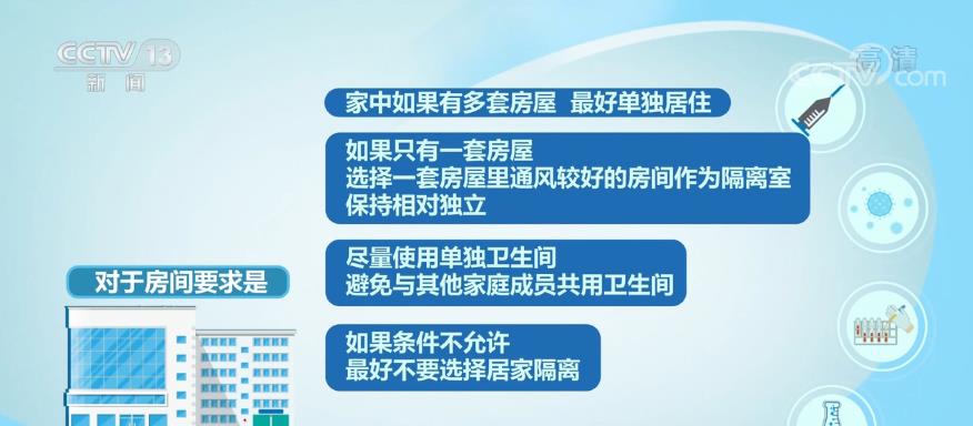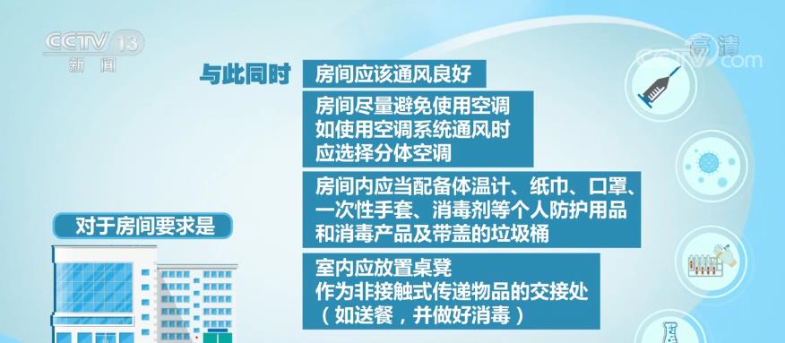 對(duì)于房間要求是,家中如果有多套房屋,最好單獨(dú)居。蝗绻挥幸惶追课,選擇一套房屋里通風(fēng)較好的房間作為隔離室,保持相對(duì)獨(dú)立。盡量使用單獨(dú)衛(wèi)生間,避免與其他家庭成員共用衛(wèi)生間。如果條件不允許,最好不要選擇居家隔離。與此同時(shí),房間應(yīng)該通風(fēng)良好;房間盡量避免使用空調(diào),如使用空調(diào)系統(tǒng)通風(fēng)時(shí),應(yīng)選擇分體空調(diào)。房間內(nèi)應(yīng)當(dāng)配備體溫計(jì)、紙巾、口罩、一次性手套、消毒劑等個(gè)人防護(hù)用品和消毒產(chǎn)品及帶蓋的垃圾桶。室內(nèi)應(yīng)放置桌凳,作為非接觸式傳遞物品的交接處(如送餐,并做好消毒)。