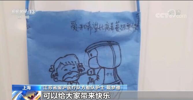 除了有心愿墻,方艙里的“大白”們還和患者們一起開展“套圈游戲”等趣味活動來幫助大家緩解放松心情。“95后”護士戴夢雅和同事在艙內工作時,發現“大白”防護服沒有口袋很不方便,她便就地取材自制了這種別具一格的小包,擅長畫畫的她還在上面繪制了各種可愛的漫畫造型。