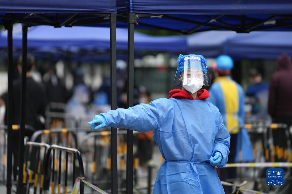 在北京市朝陽區(qū)八里莊街道一處核酸檢測點,來自北京一家傳媒文化有限公司的志愿者張書琪在引導(dǎo)參加核酸檢測的人員有序排隊(5月8日攝)。張書琪今年25歲,這是她第一次參加疫情防控志愿工作。
