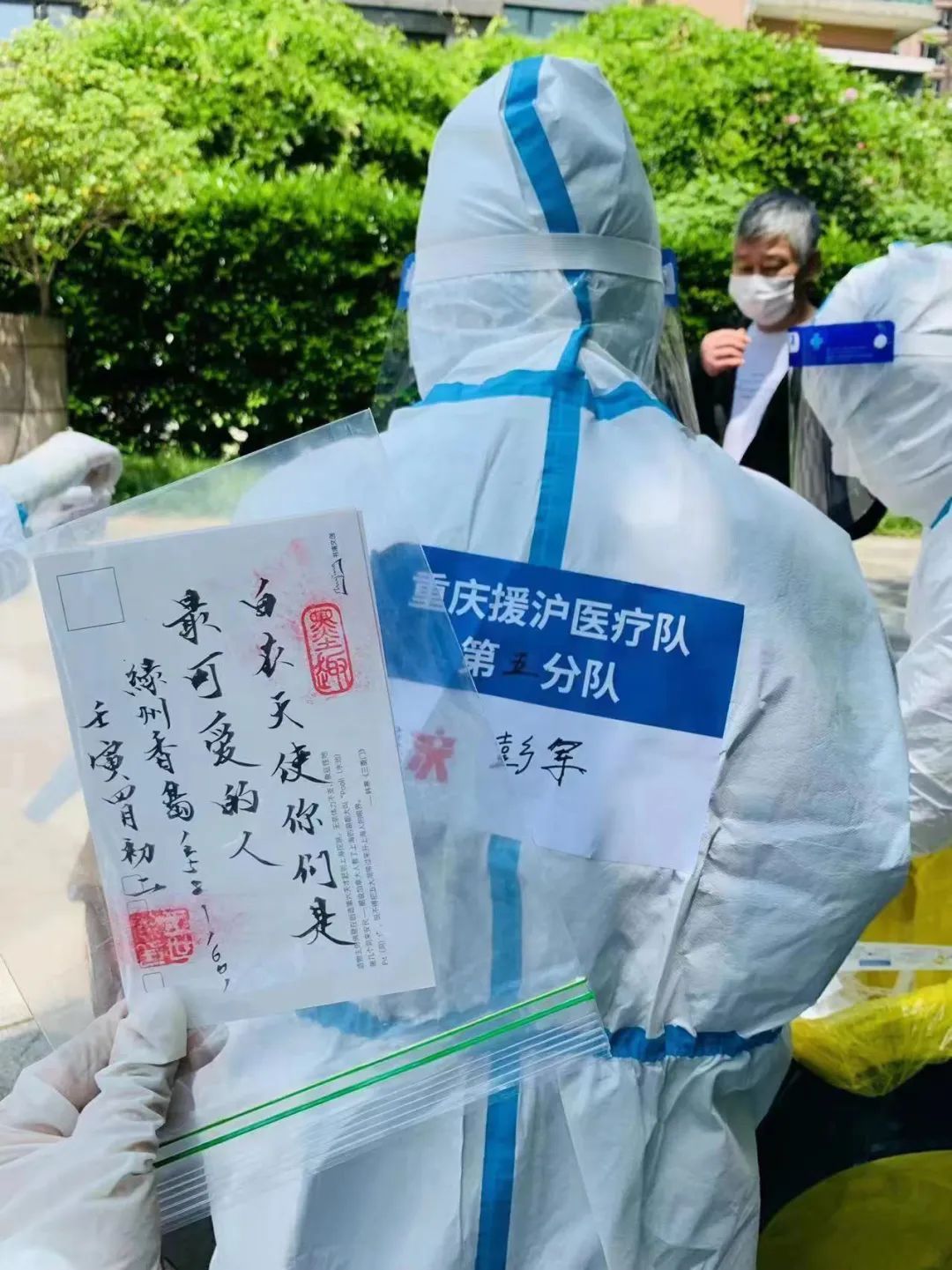 “日曬雨淋、衣服濕透、雙手浸皺,但大家從不叫苦。”潘傳波動情地說,截至5月6日,重慶市援滬醫療隊已開展核酸采樣289.8萬人次,“隊員們高效、專業、嚴謹的服務,得到居民的高度贊賞,很多人自發送來感謝信、明信片和祝福卡,讓我們感到非常暖心。我們再苦再累,也要幫上海打贏大上海保衛戰。”