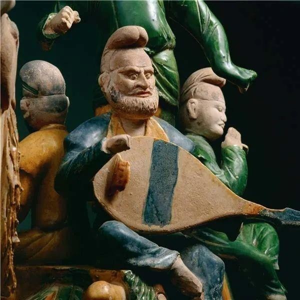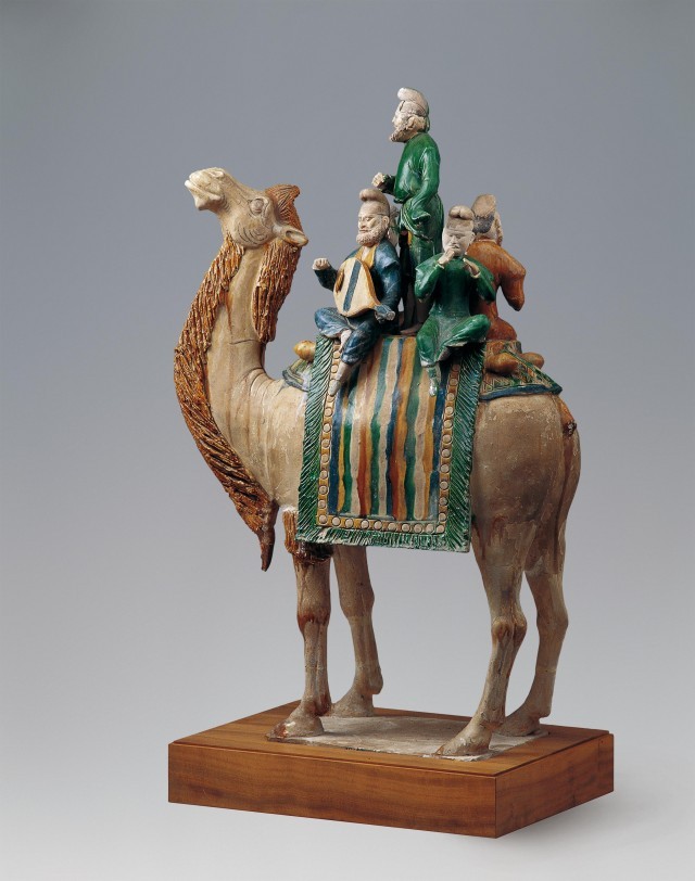 唐代陶駱駝載樂舞三彩俑,于1957年出土于陜西省西安市鮮于庭誨墓,現(xiàn)收藏于中國國家博物館